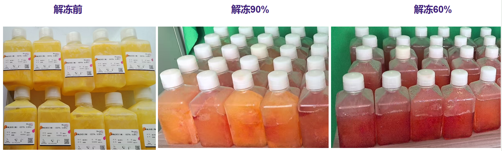 | 产品详情 | Ø 在组织细胞的体外培养和原代细胞培养中的组织细胞分散(将组织块制备成单个细胞悬液)以及传代细胞培养中,贴壁生长细胞的消化分散均要使用组织细胞消化液。常用的消化液为胰蛋白酶,EDTA等,其功能主要是使细胞间的蛋白质(如细胞外基质)水解,使组织或贴壁细胞分散成单个细胞,制成细胞悬液用于进一步的实验。 Ø 圣尔生物生产的胰蛋白酶消化液(Trypsin Solution)含0.25%胰酶,溶于无钙镁平衡盐溶液中,经过滤除菌,可以直接用于培养细胞和组织的消化。本产品具有方便快速、稳定安全、细胞状态好等特点。通常室温消化2-5 min分钟左右就可以消化下大多数贴壁细胞。 注意: 下图为我们同一批次的胰蛋白酶,缓冲体系随温度而变化,冻存状态是黄色的,溶解状态是红色。