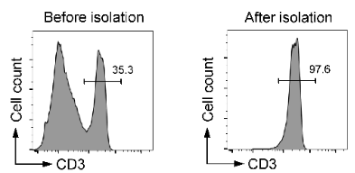 图:利用小鼠CD3+ T细胞分选试剂盒从C57BL/6小鼠脾脏细胞中分选CD3+ T细胞,分选前后的细胞用FITC anti-mouse CD3抗体标记后进行流式细胞仪分析,分选前后的CD3+ T细胞纯度分别为35.3%和97.6%。 |