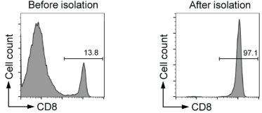 图:分选小鼠脾脏CD8+ T细胞后, CD8+ T细胞的纯度检测结果。使用 Mouse CD8+ T Cell Isolation Kit (negative selection)从C57BL/6小鼠脾脏细胞中分选CD8+ T细胞。分选前和分选后的细胞用FITC标记的anti-mouse CD8抗体染色后进行流式细胞仪分析,分选前后的CD8+ T细胞纯度分别为13.8%和97.1%。