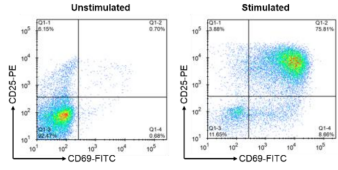 图:使用人 CD3/CD28 T 细胞激活磁珠,刺激 CD3+ T 细胞 24到 48 小时,细胞用 FITC anti-human CD69 抗体和 PE anti-human CD25 抗体标记,进行流式细胞仪分析。刺激前后 CD25+CD69+ T 细胞占总细胞的比例分别为 0.70% 和 75.81%。 |
