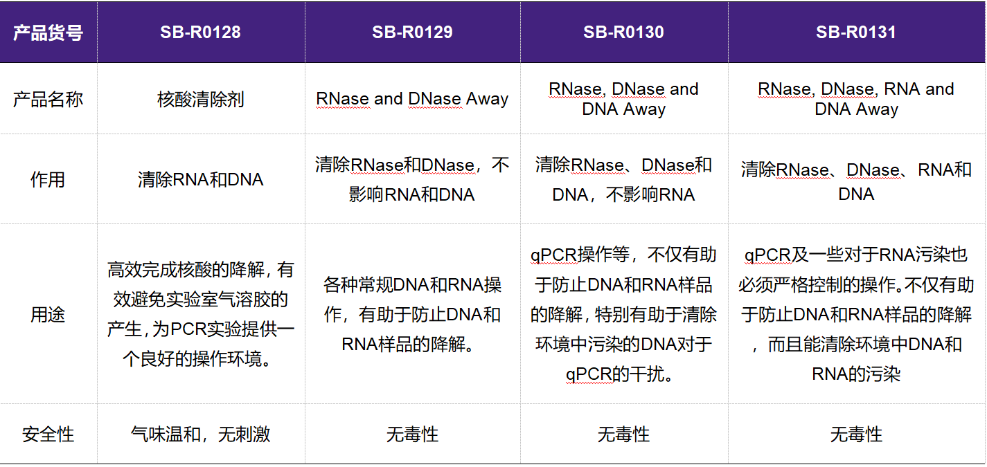 | 产品详情 | 【产品简介】 RNase and DNase Away,是一种高效清除核酸酶的无毒喷洒型试剂,可以高效清除实验仪器、设备、材料固相表面的 RNase、DNase 等核酸酶污染,创造洁净的 RNase 和DNase free操作环境,降低假阳性或假阴性对实验结果的影响。 本产品适用的实验仪器设备如移液器、PCR仪、离心机、实验台、试管架、离心管架电泳槽等,及实验耗材如离心管、枪头、手套等表面核酸酶污染的清除,对于塑料制品、乳胶制品、玻璃制品、不锈钢制品均有效。 【产品优势】 u 使用比较安全,无毒性,在某些用途方面是一种非常安全的 DEPC 替代品; u 使用便捷,使用时直接将本产品均匀喷酒于固体表面,约5分钟后用洁净纸巾擦拭干净即可进行后续的实验操作。 【产品对比】 圣尔生物的核酸清除剂(SB-R0128)、RNase and DNase Away (SB-R0129)、RNase, DNase and DNA Away (SB-R0130)和RNase, DNase, RNA and DNA Away (SB-R0131)是固相表面清除试剂的系列产品。每种产品能够清除的核酸酶和核酸的范围有所不同,下表是这四种产品的主要特点和差异,请根据实验的实际需求参考下表进行比较和选择。