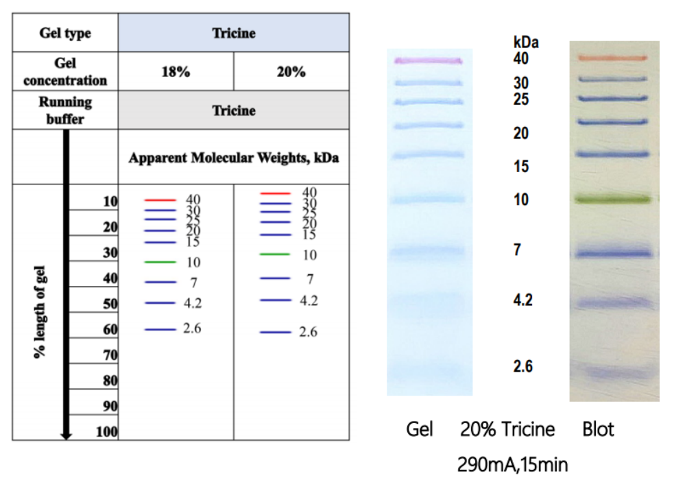 Tris-Tricine电泳缓冲液: Tris-tricine 缓冲系统的 PAGE 电泳主要由 Tris、tricine、SDS 组成。本产品适用于 Tris-Tricine 缓冲液系统分离多肽,使用时需用蒸馏水或去离子水稀释至 1X 后使用。 Tricine 蛋白上样缓冲液 (2X): Tricine 蛋白上样缓冲液 (2X),是一种以考马斯亮蓝为染料,含变性剂 DTT 、SDS 的缓冲液,常用于 Tris-tricine 缓冲系统的 PAGE 电泳的蛋白样品的上样,以便分析蛋白质。 小分子专用蛋白marker: 圣尔生物低分子量彩色预染蛋白分子量标准包含了从2.6kDa到40kDa共9种高度纯化并预染的重组蛋白质(2.6, 4.2, 7, 10, 15, 20,25, 30, 40kDa),其中40kDa条带为橙红色,10kDa为绿色。标示表观分子量经过thermo26632非预染蛋白质分子量标准标定。适合作为SDS-PAGE和Western的蛋白质分子量标准。 本彩色预染蛋白质分子量标准已经配制在1×SDS-PAGE上样缓冲液中,直接使用,不要煮沸、稀释和加入还原剂处理。根据上样孔的大小,本彩色预染蛋白质分子量标准通常每次上样5-10微升(5×1.5mm胶孔5ul足够),即可在电泳时、电泳后和转膜后观察到非常清楚的蛋白条带。